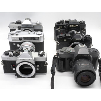 1x Zenit B (cuerpo # 70190561) Funciona. Obturador funciona en todas las velocidades, aunque se puede mostrar perezoso en ciertas velocidades. Autodisparador funciona. Visor limpio.