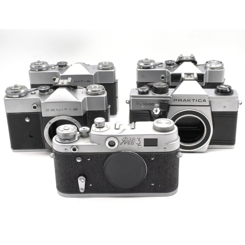 1x Zenit B (cuerpo # 72209879) Funciona. Obturador funciona en todas las velocidades. Visor limpio. Falta la palanca del autodisparador.
